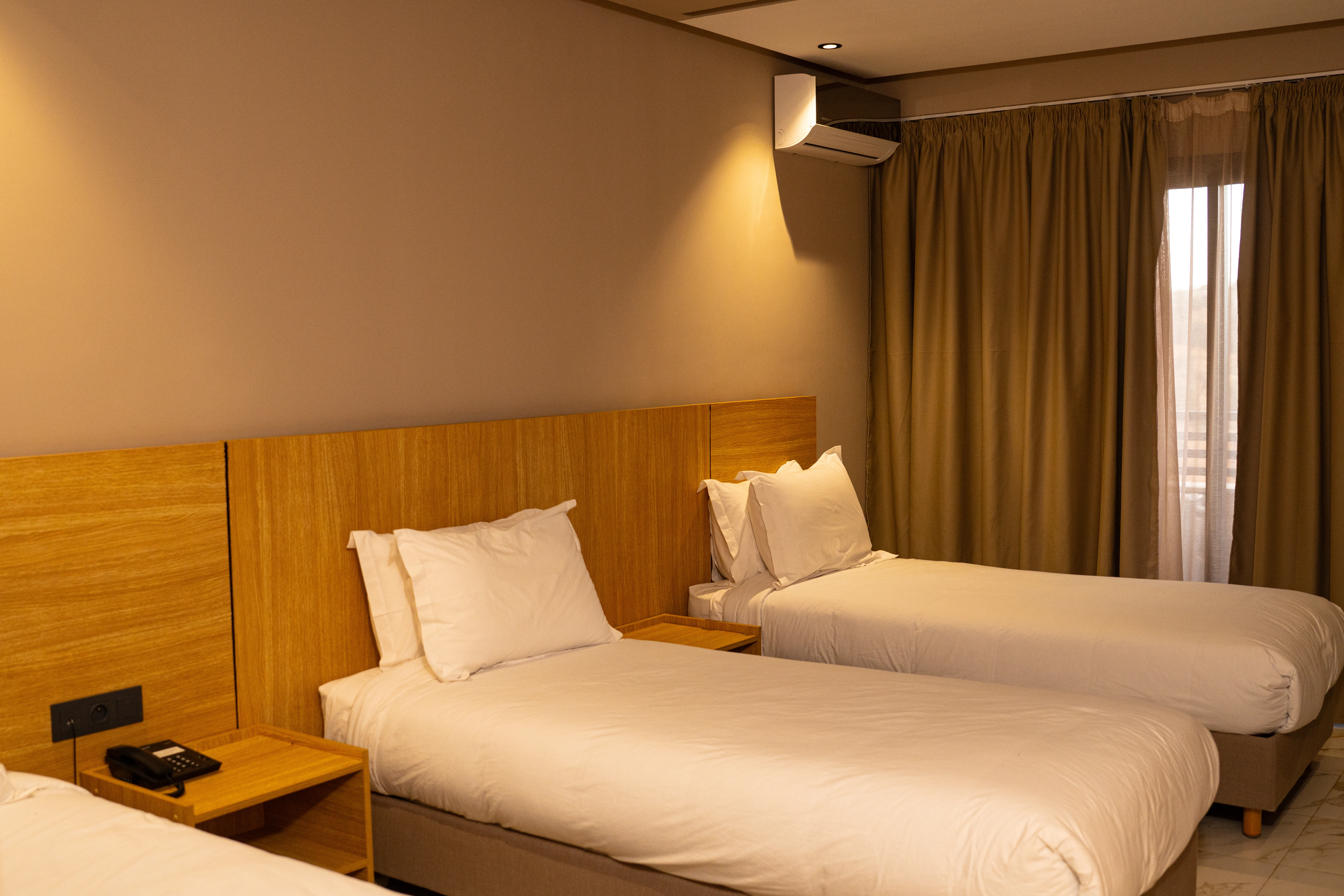 Optez pour l'excellence avec notre Chambre Triple Supérieure. Avec ses 39 m² généreux, elle offre un confort accru pour 3 personnes dans un cadre élégant et raffiné. Idéale pour un séjour entre amis ou en famille, elle dispose de trois lits confortables et d'un coin salon convivial.